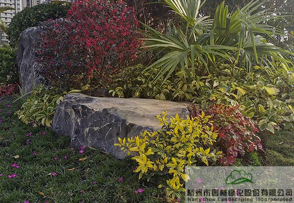 項目中應用了許多景石,為了避免出現(xiàn)視覺的疲憊,每塊景石的形態(tài)、大小、植物配置都各有千秋。在一些入口和節(jié)點處,通過景石與色葉植物、開花植物、球類植物的有機搭配,營造出一個個意趣盎然的花境景觀。