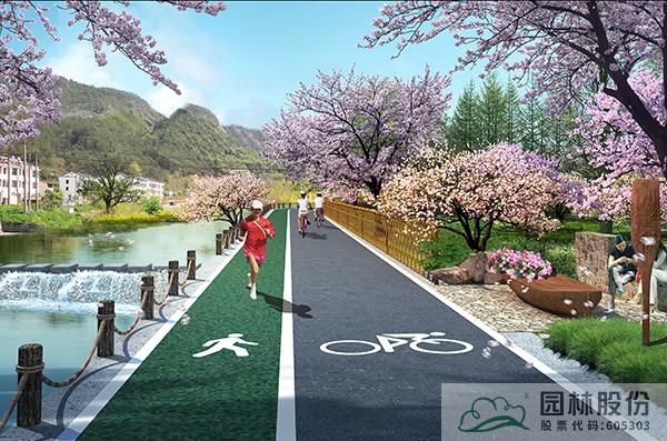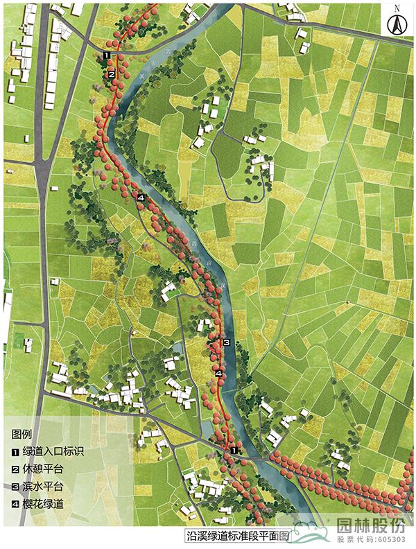 沿溪綠道為櫻花環(huán)中濱河段落,該標(biāo)準(zhǔn)段長(zhǎng)度為730m,總長(zhǎng)2590m。以春季櫻花為主題,打造浪漫的濱水慢行系統(tǒng),沿線打造休憩空間,設(shè)置休憩設(shè)施,并在入口處設(shè)計(jì)特色標(biāo)識(shí),成為村民通行休閑健身的浪漫步道。