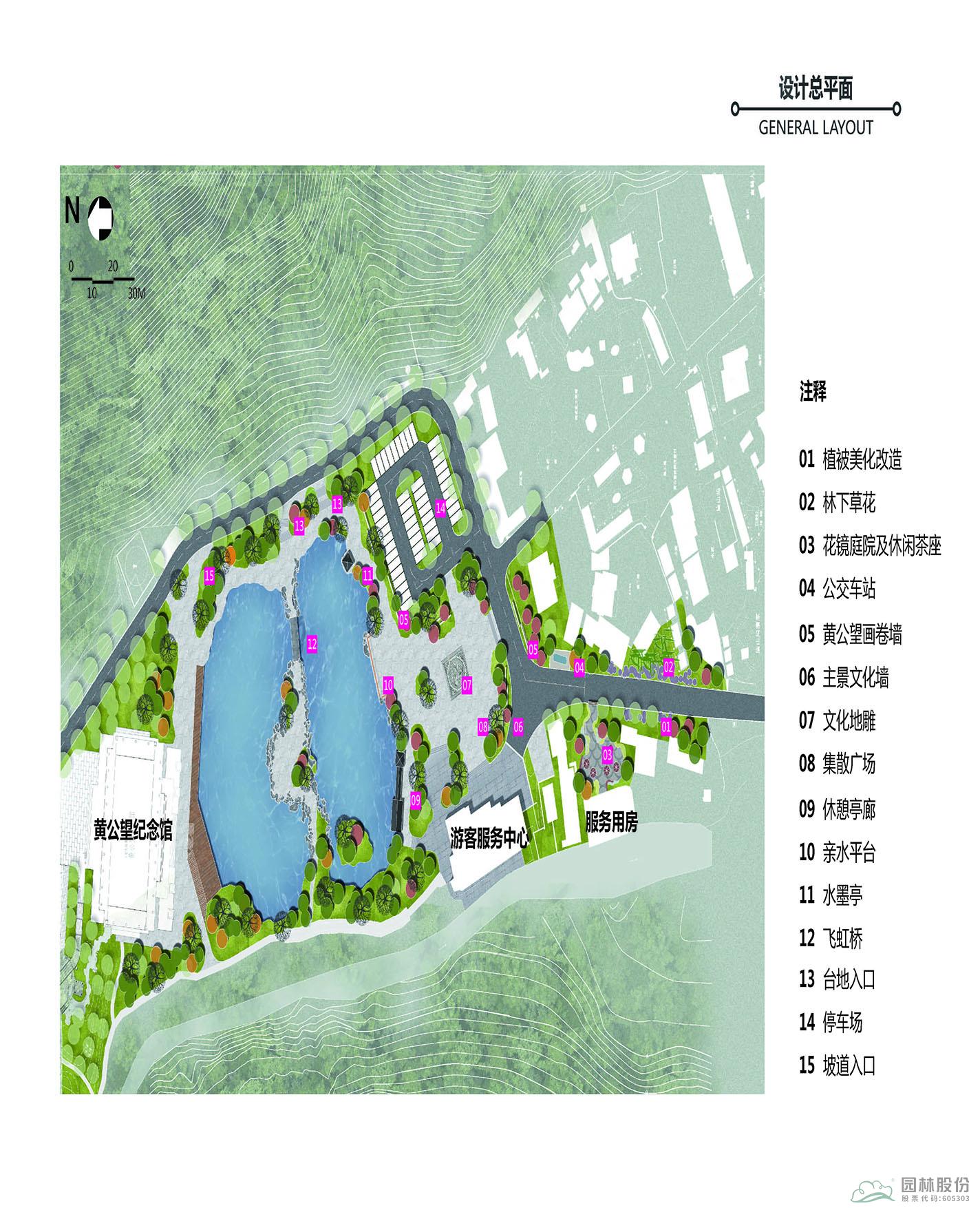 項(xiàng)目位于黃公望隱居地入口,環(huán)境清幽,具有極好的生態(tài)條件。入口區(qū)有黃公望紀(jì)念館和接待中心兩處主要功能區(qū),其間有竹林碧譚鑲嵌其中。
